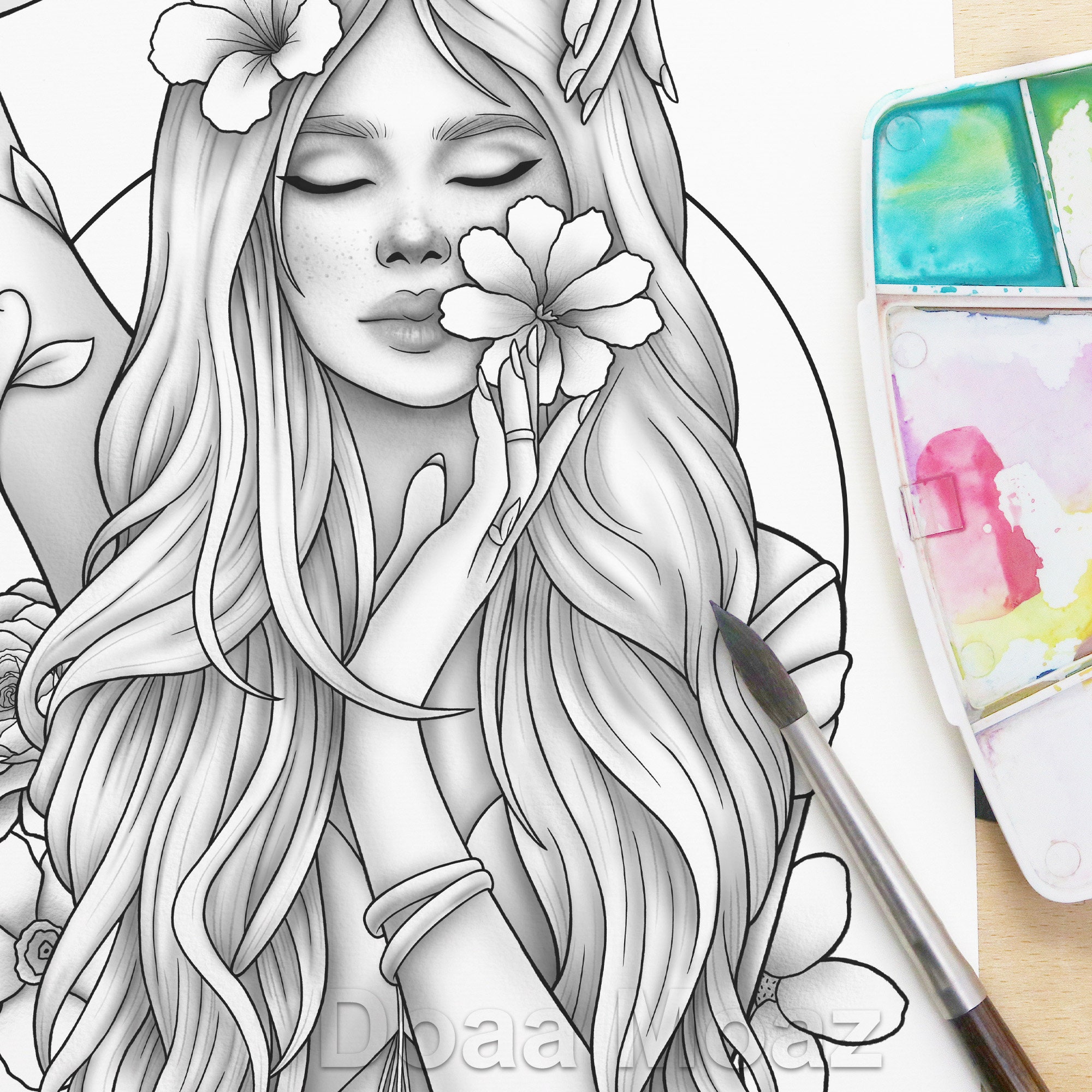Printable Coloring Page Fantasy Character Girl Floral Etsy De
